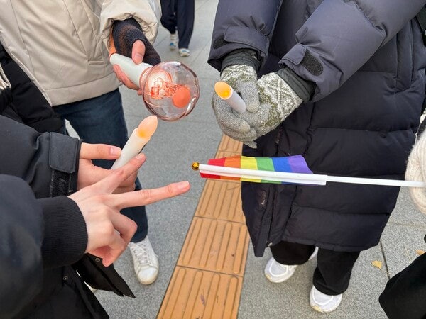 El Sr. Mong y sus amigos muestran palos de luz y banderas del orgullo ⓒReportero Shin Da-in